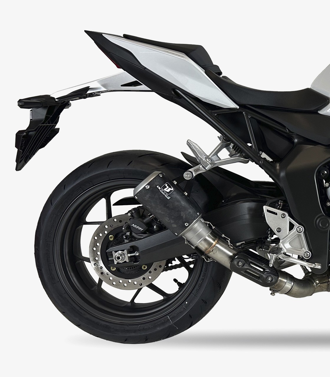 Get the IXRACE MK2 exhaust, designed with a conical structure and made of carbon fiber with a stainless steel end cap.