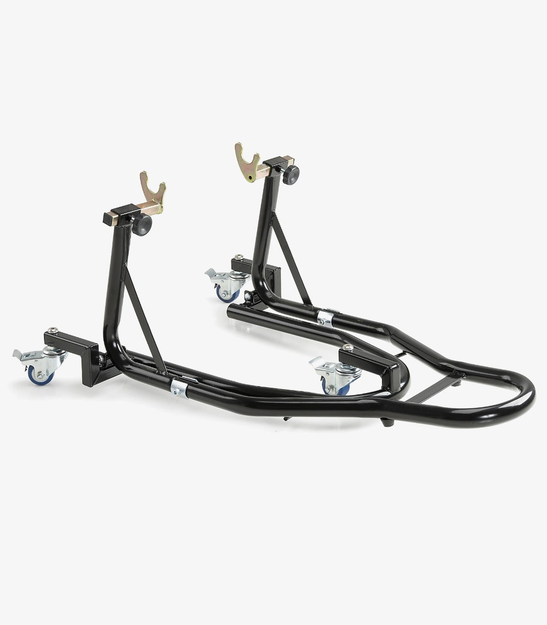 This rear wheel stand is designed to lift the motorcycle securely, combining robustness, stability, and low weight. Built from aluminum, it incorporates integrated rubber wheels that make it easier to move and position.