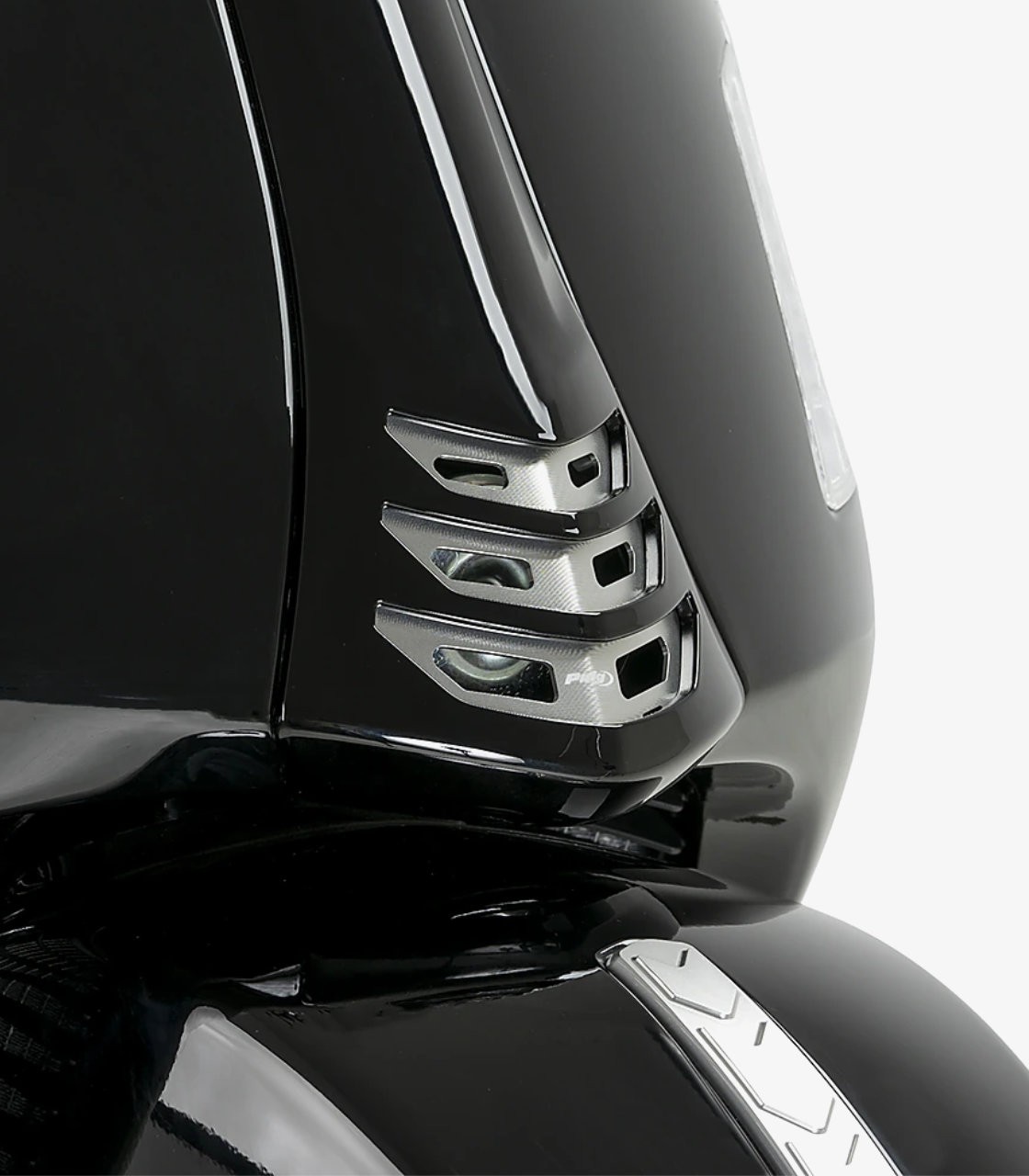 The Puig horn cover for Vespa is designed to give the scooter’s front area a more refined and distinctive look. It blends a design that respects the timeless Vespa style with a modern finish that enhances the bike’s overall appearance while preserving its iconic character.