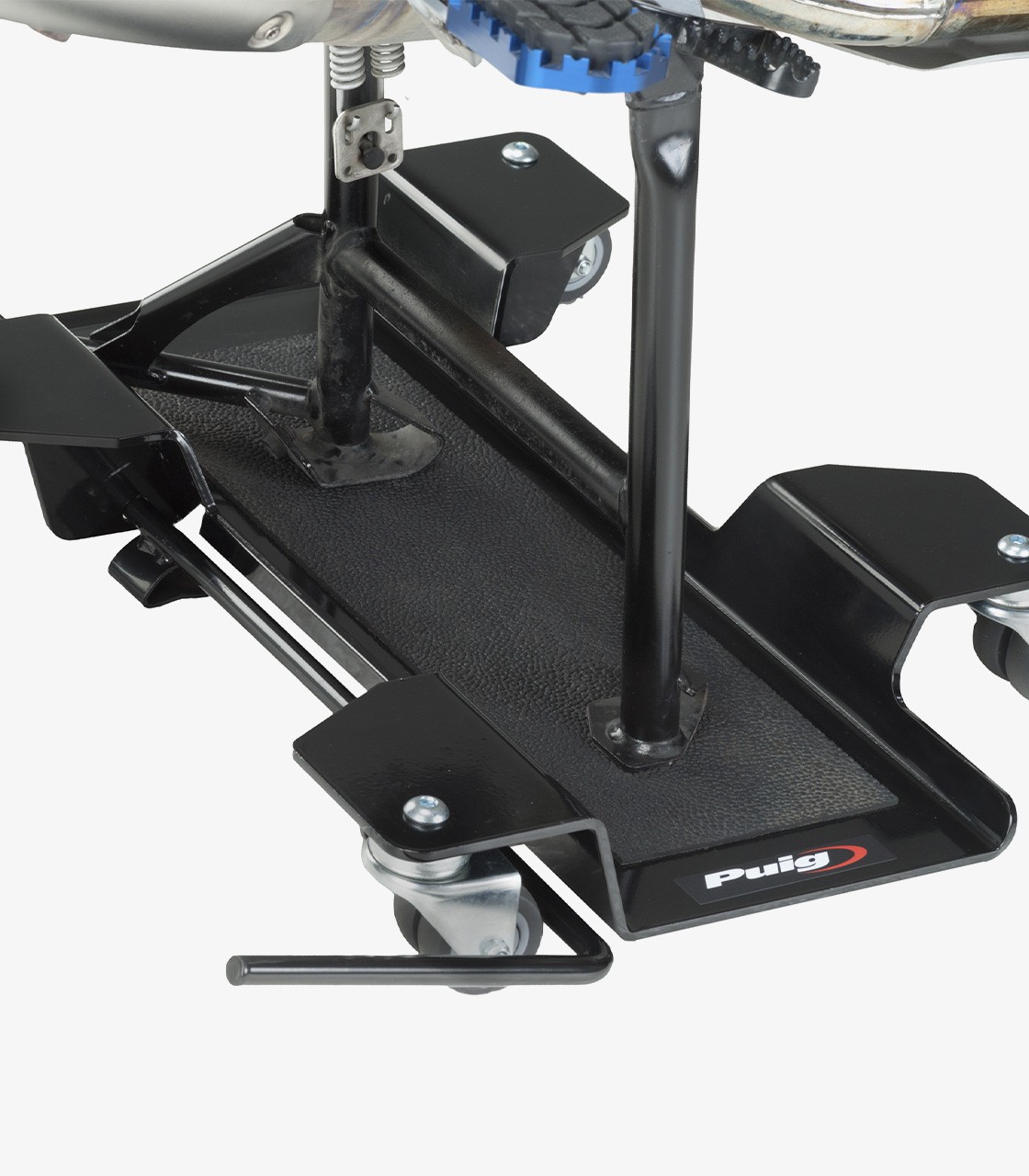 Mantener tu moto estable y en perfectas condiciones ahora es más fácil con la peana de aparcamiento para caballete central de Puig. Diseñada tanto para facilitar tareas de mantenimiento como para ofrecer una sujeción firme al estacionar, es una herramienta práctica para cualquier motociclista que cuide su vehículo.