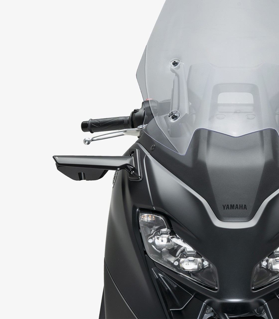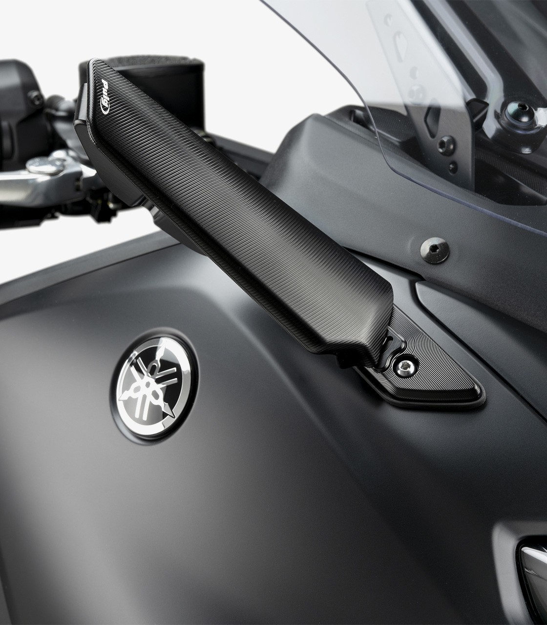 Puig reúne en un único componente los alerones Downforce laterales con retrovisor integrado, además de permitir la incorporación del intermitente TAB. El desarrollo, basado en tecnología de túnel de viento virtual y en la experiencia de la marca en MotoGP y SBK, da como resultado una pieza mecanizada en aluminio anodizado que mejora el comportamiento aerodinámico. Genera hasta 3 kg de carga sobre el tren delantero a 250 km/h, aumentando la estabilidad, favoreciendo el paso por curva y reduciendo el efecto wheelie, todo ello con una estética deportiva y compacta.